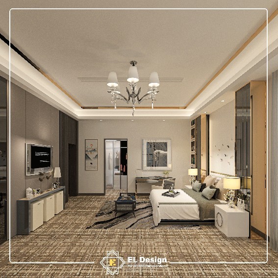غرفه نوم ماستر مودرن بالوان هادئه وجذابه مع استخدام جزء للجلوس منفصل واستخدام مكتبه بالحائط