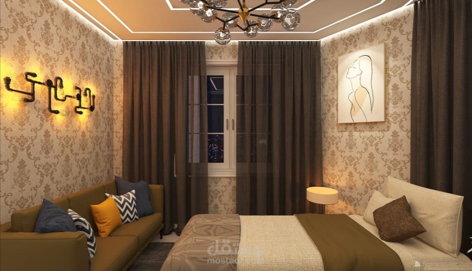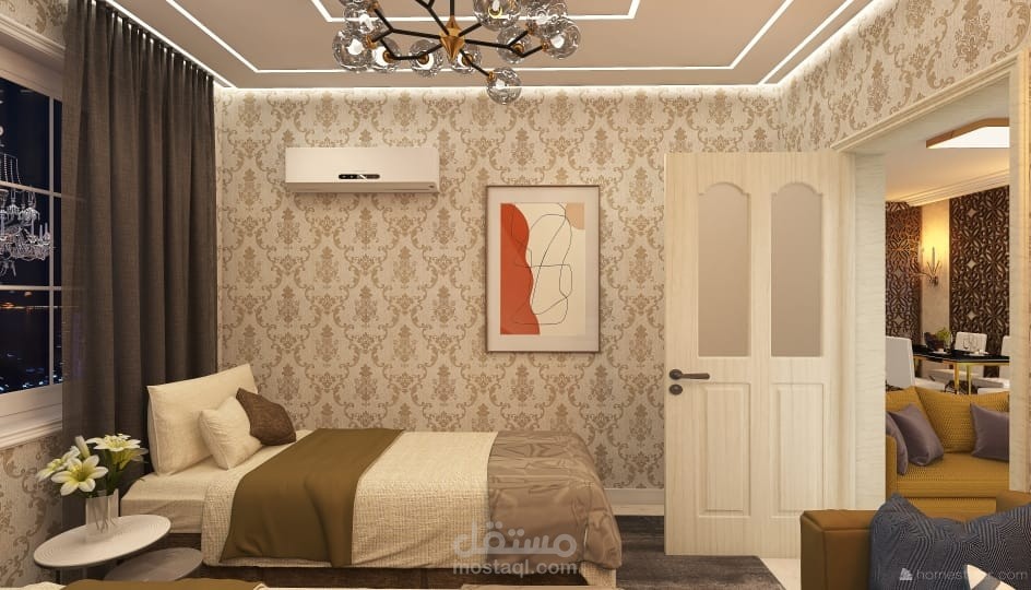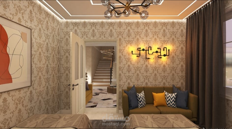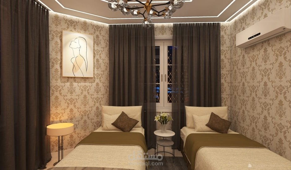 تصميم داخلي لغرفة استقبال مكونة من سريرين و Sofa