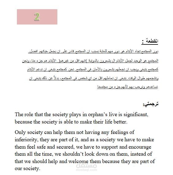 ترجمة قطعة تاريخية صغيرة من انجليزي لعربي, وترجمة قطعة تتحدث عن حالة بالمجتمع من عربي لانجليزي.