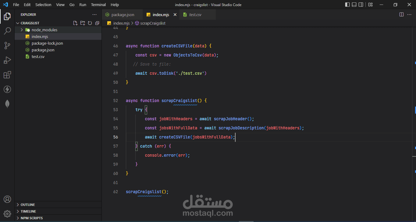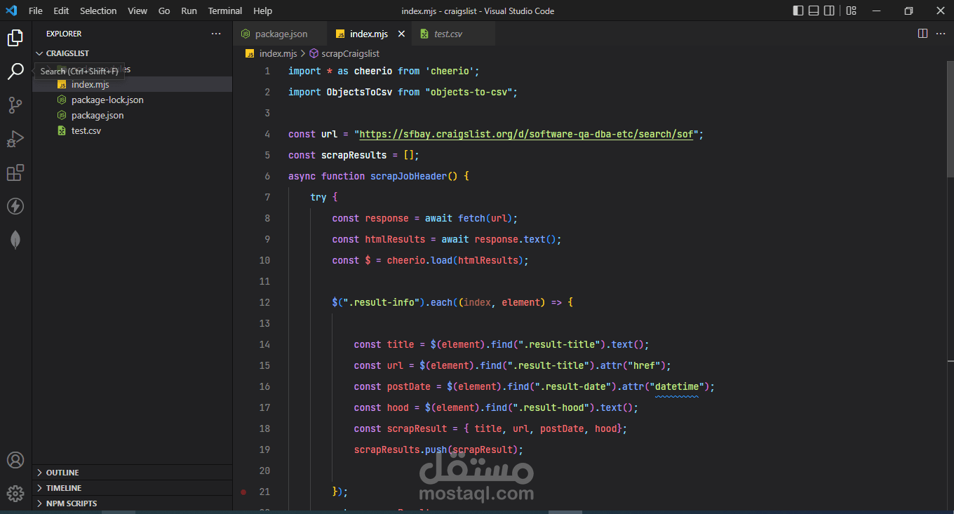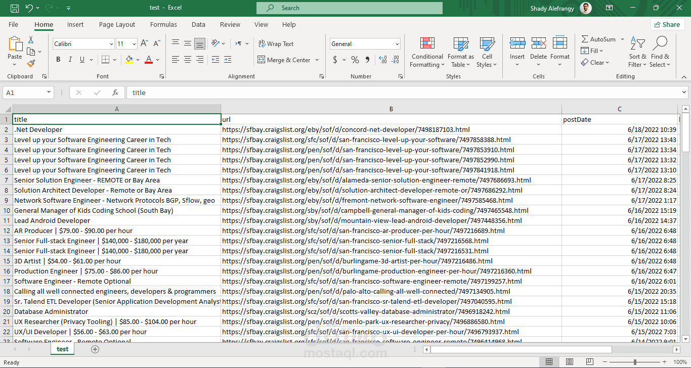لقد قمت باستخراج بيانات معينة من موقع Craigslist Jobs وتخزين هذه البيانات في ملف من نوع CSV وقمت بتقسيم العمل الى 3 اقسام: