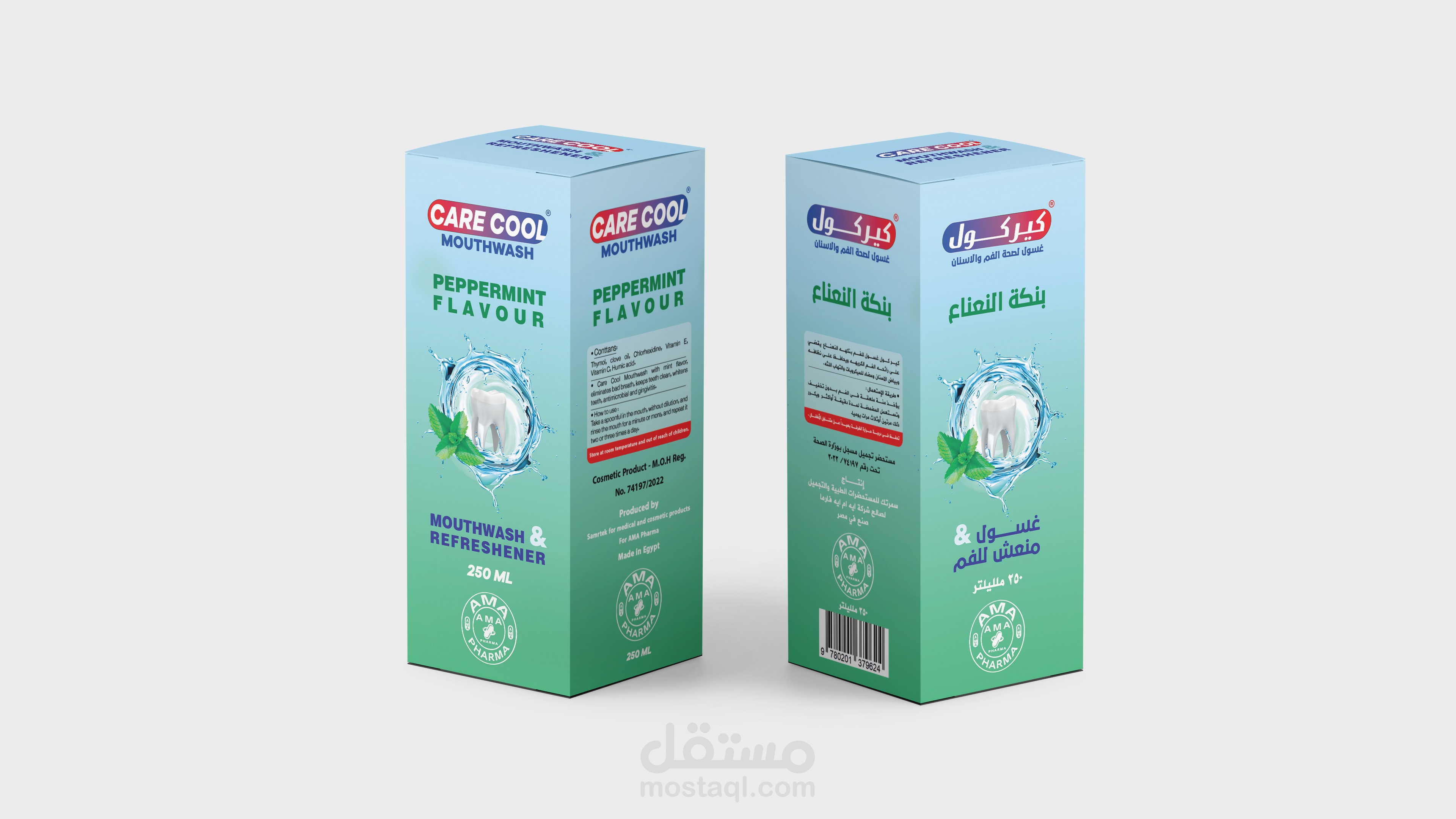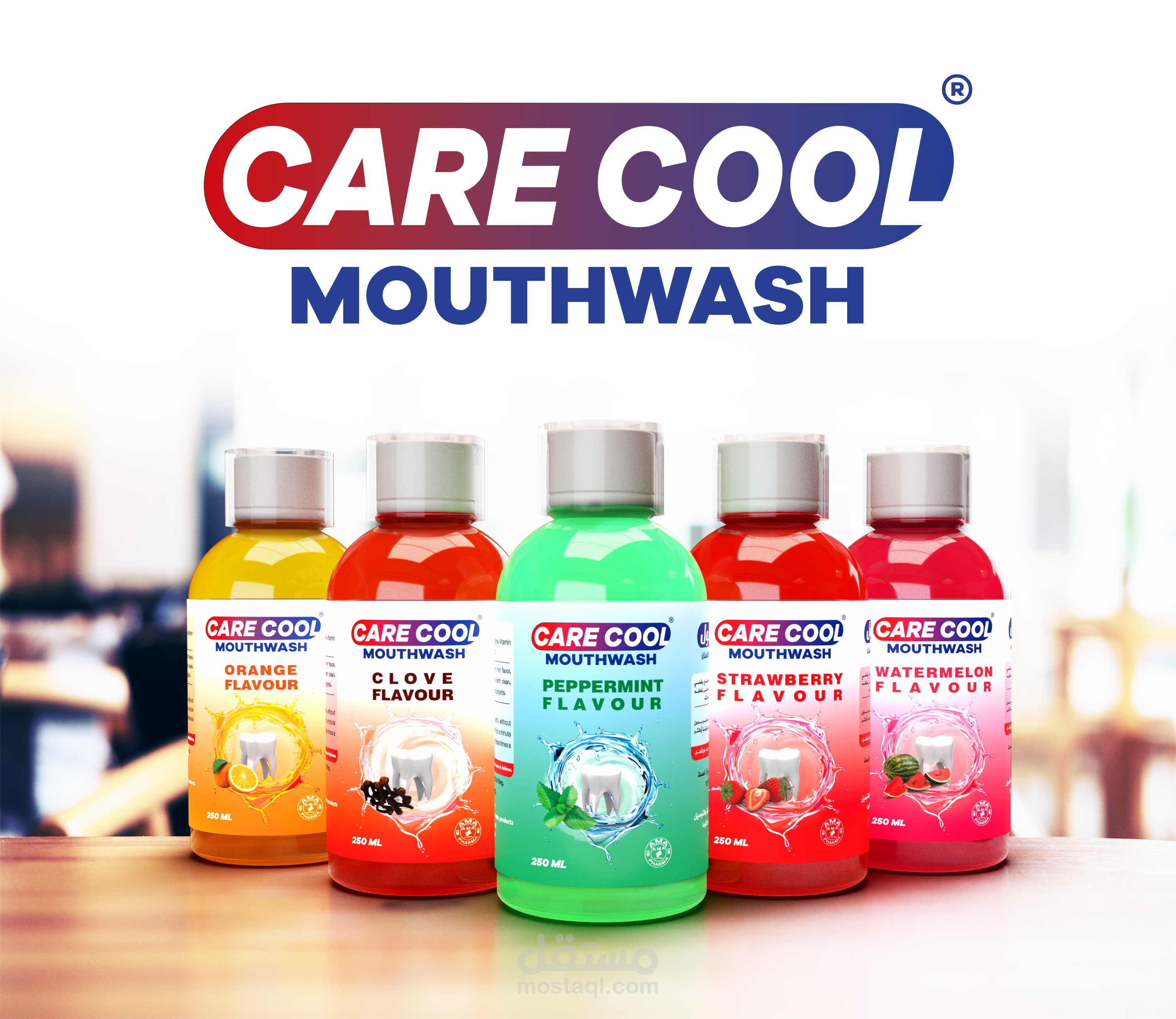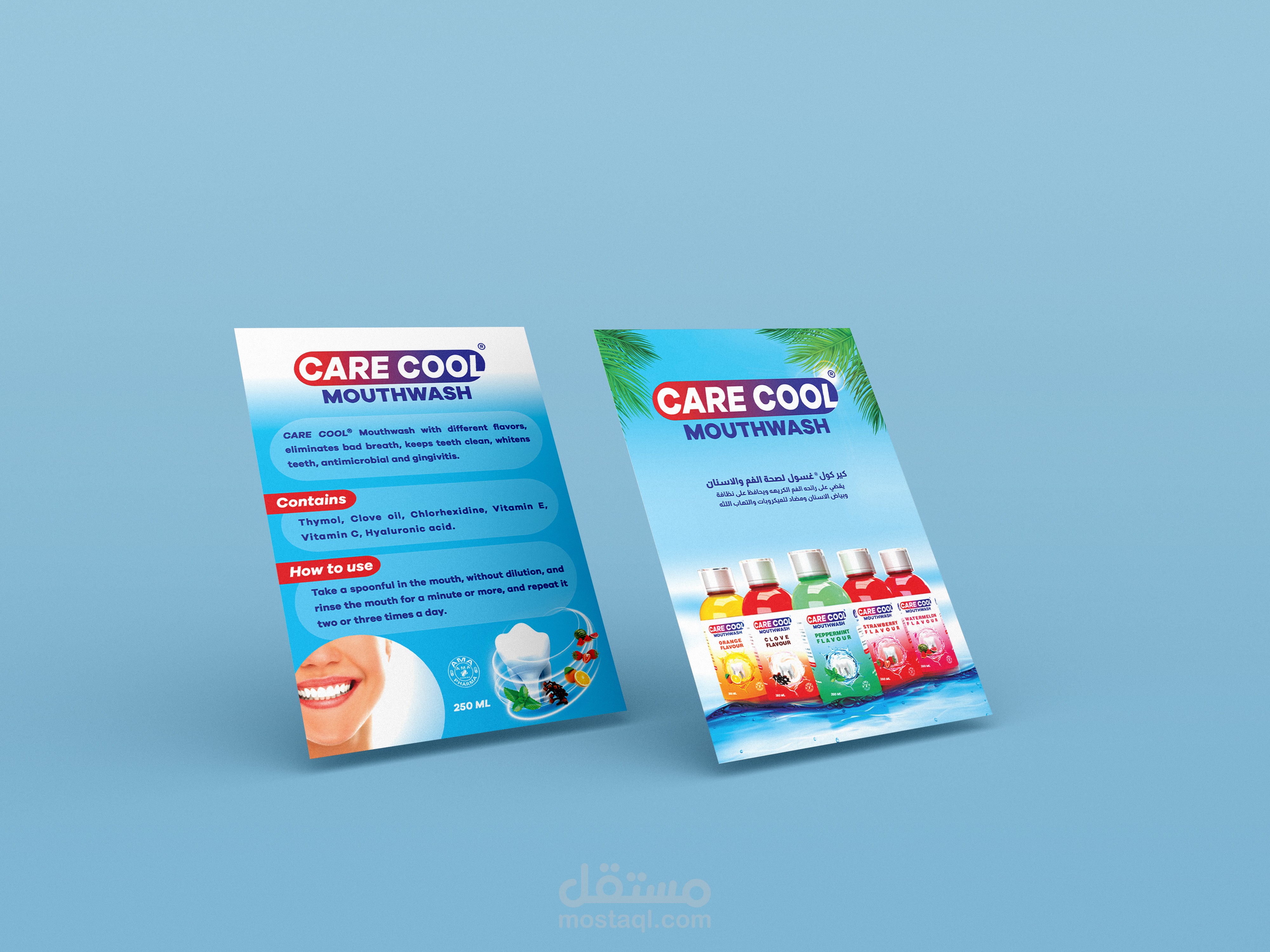 تصميم تغليف منتج كير كول غسول للفم بخمس نكهات مختلفة وانشاء بروشور للمنتج