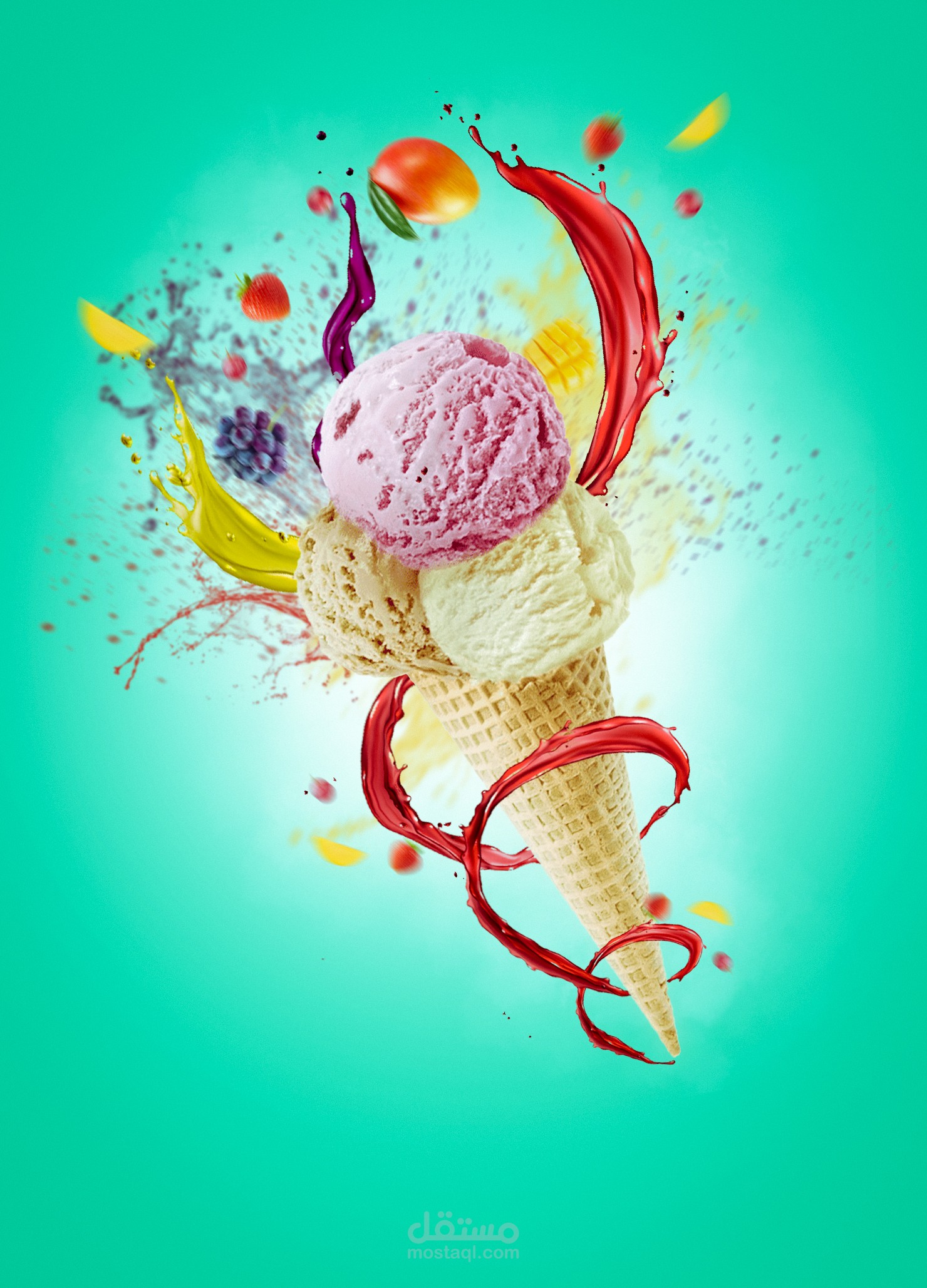 اعلان لايس كريم بالشكولاتة والفانيليا واخر بالفواكه