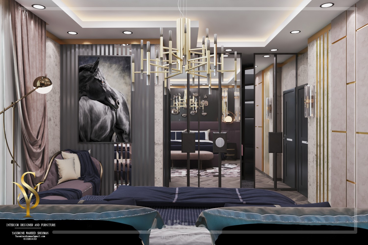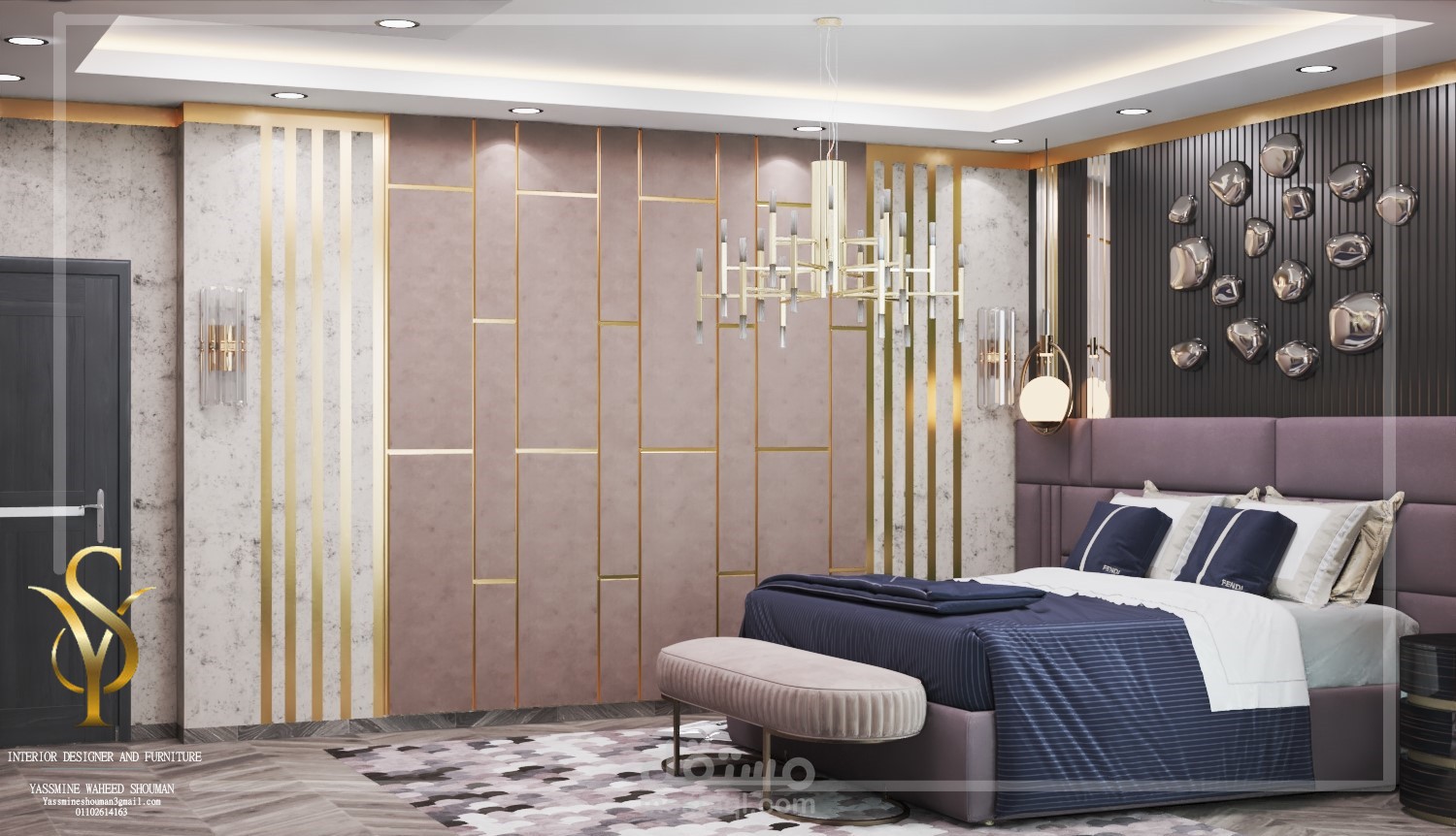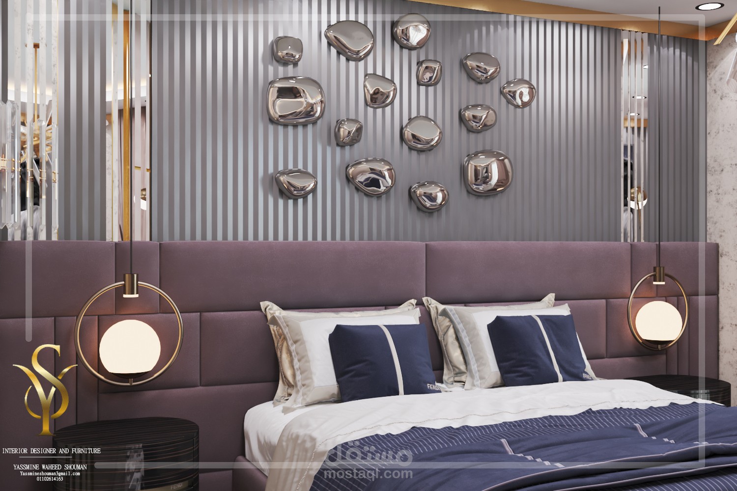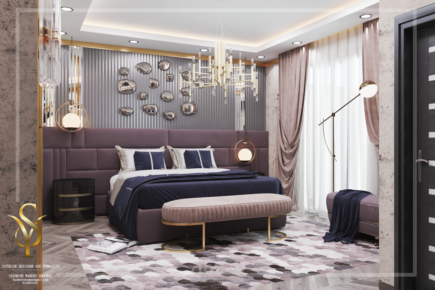 تصميم لغرفة نوم رئيسيه بها حمام خاص معرض في سابقة الاعمال يتميز باللون الارجواني و يوجد بها dressing room صغير توفر مساحه اخرى في الغرفه تصميم مودرن مريح حدا