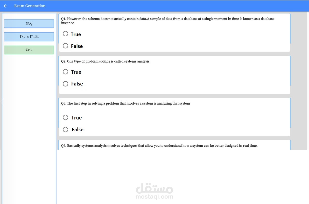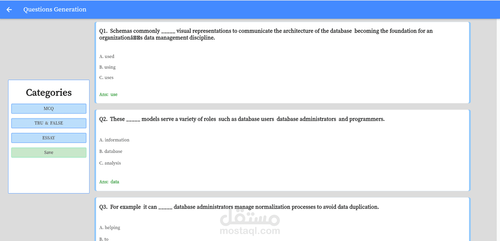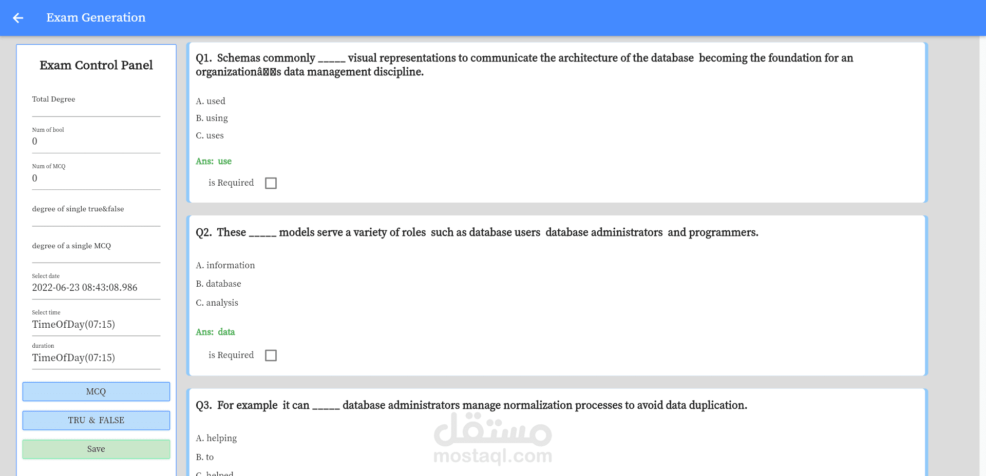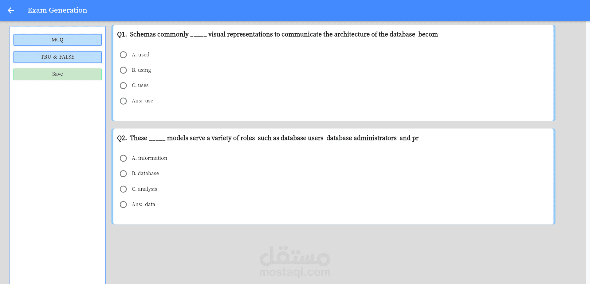 Automatic Exam Generation and Correction:- using Ai models to with help nlp to creat questions from text , mcq questions ,true&false questions and essay questions . after generate questions the professor choosses some of questions to create exam for student ...............................................................................................