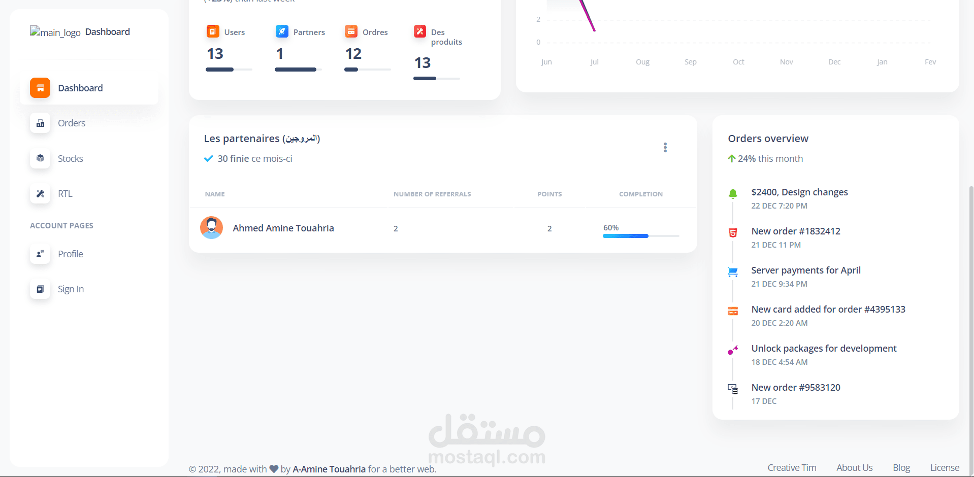 1 قسم الصفحة الرئيسية : تحتوي على الاحصائيات العامة و المنحنيات البيانية المعبرة عن المبيعات و الطلبات