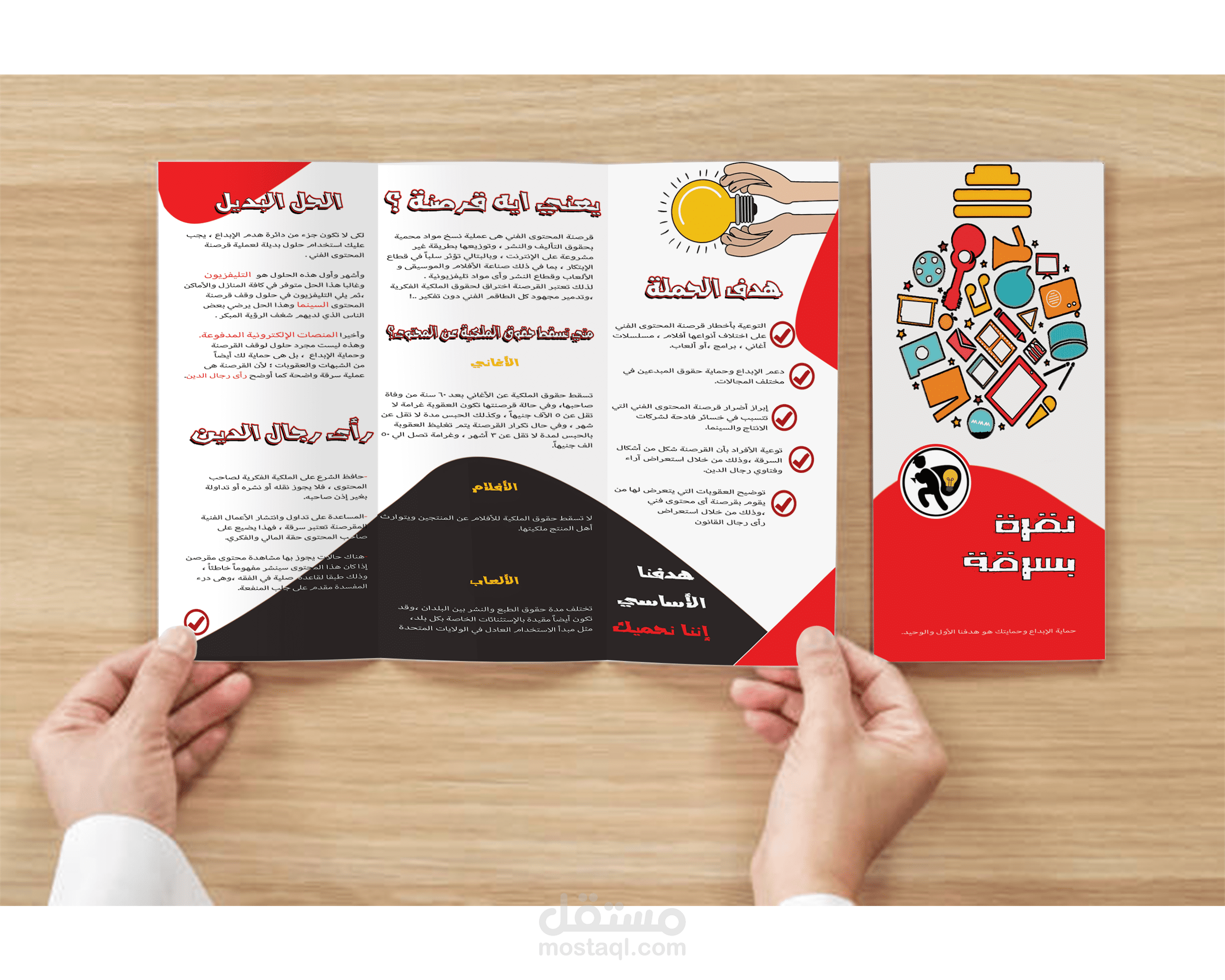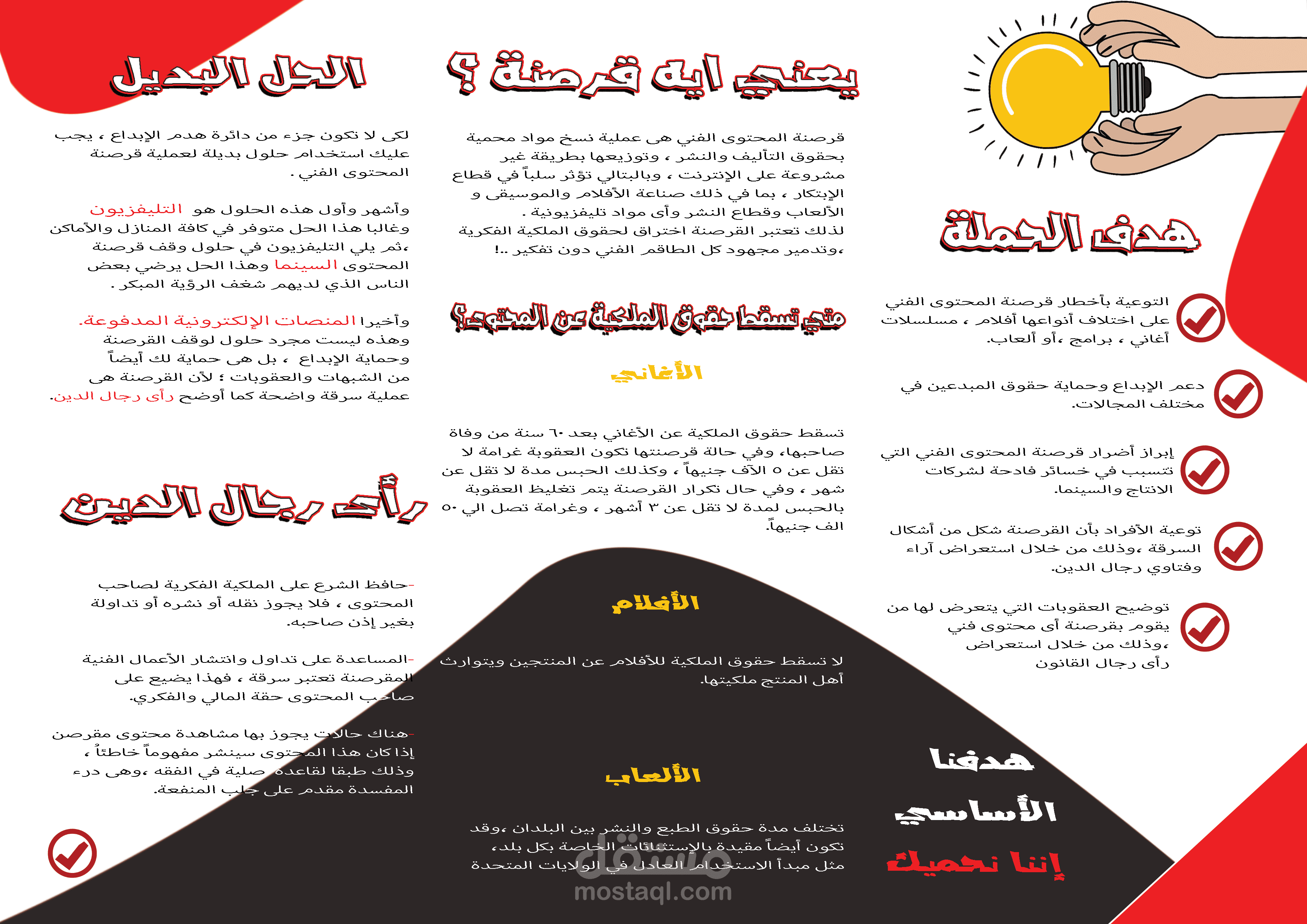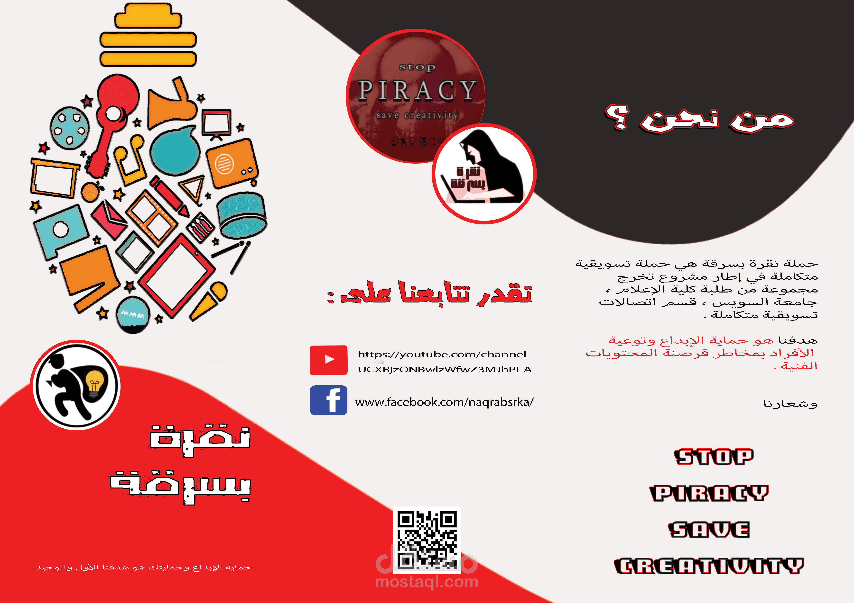 بروشور لحملة توعوية للحد من قرصنة المحتوى الفني ،مثل الأفلام ،الألعاب ،المسلسلات و الأغاني ،ومباريات كرة القدم وكذلك البرامج ، وذلك لحماية الابداع والمبدعين.