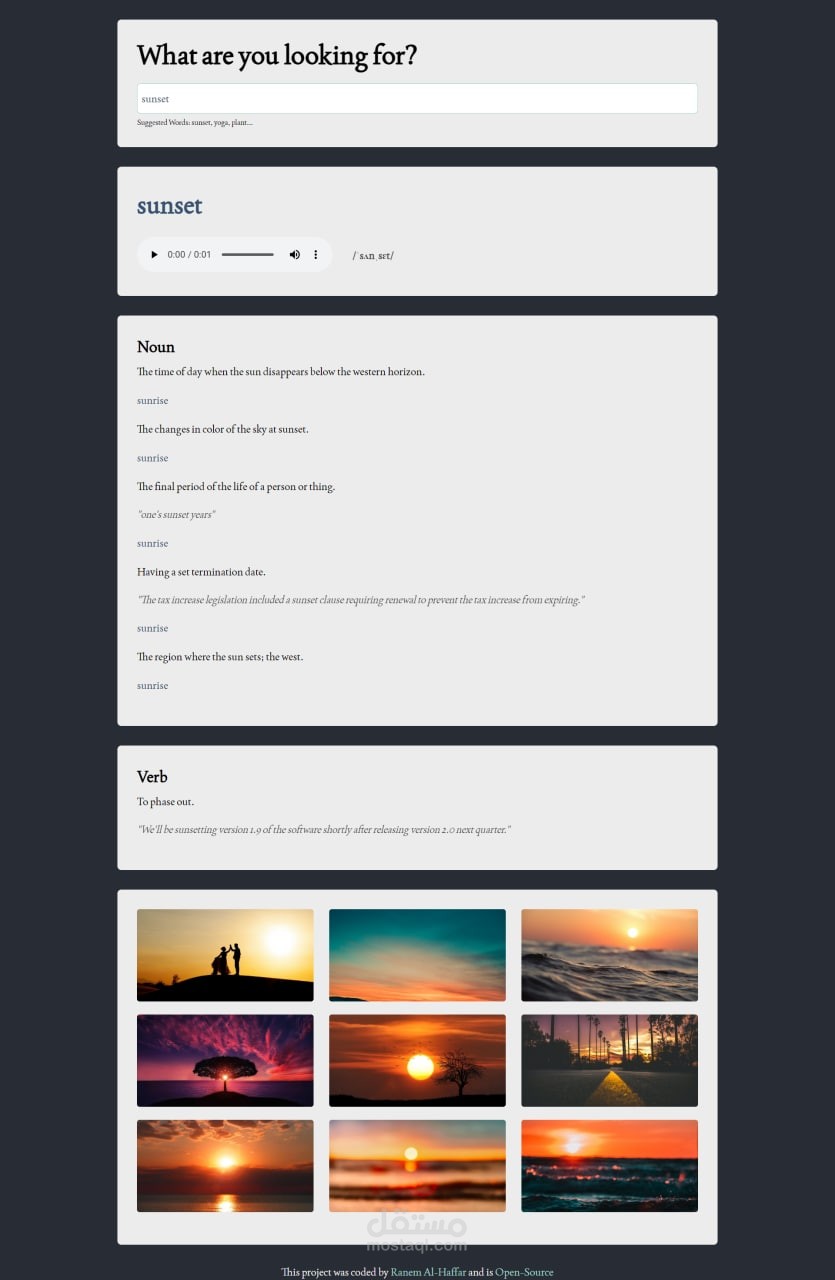 تم تصميم هذا الموقع باستخدام React, يتيح الموقع للمستخدم البحث عن اي كلمة أو موضوع و سيعطي التعريف الفعلي مع التطق و جميع التفاصيل الخاصة بالكلمة، كما تم استخدام نوعين من ال API في هذا المشروع.