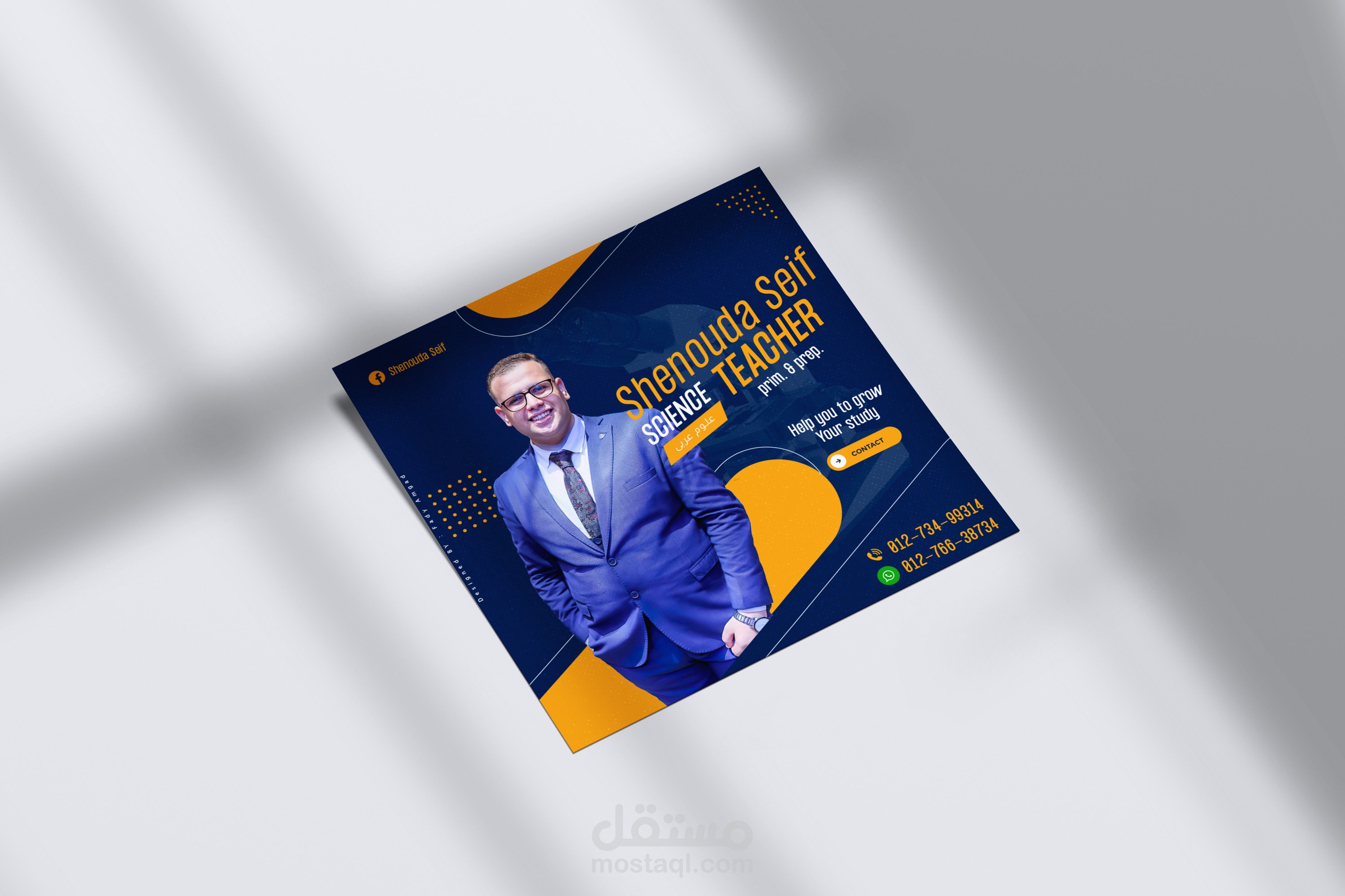 تم هذا التصميم لمعلم كان يريد دعاية لمهنة التدريس وتم تنفيذة خلال يوم واحد فقط وقد حقق هذا التصميم دعايا مُميزة واقبال مرغوب فية